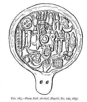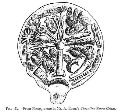 Heydemann, writing in the Gazette Archéologique, 1883, p. 7, quotes Lenormant as of opinion that they are intended for the making of mirrors in bronze. M. Albert Dumont and M. Robert de Lasteyrie support this opinion, while M. Henzey says they have served to mark the religious impression upon sacrificial cakes. Mr. Arthur Evans assumes this to be an unquestioned fact, as he simply calls them "moulds for sacred cakes." He says later (p. 49) that it seems "highly probable" that this was their purpose. Heydemann disagrees with both these opinions, and supports Jahn in the contention that they belong to the class ἀποτρόπαια, that is of prophylactic amulets; and he goes on to compare the various specimens of moulds known to him, but not including those now at Oxford, and gives to some of the objects an explanation differing from any yet noted: for instance, he finds a thimble, a rosette, a key, a wing, a lizard, etc., but admits that the objects are often very indistinct. After disputing several contentions of Minervini, he points out that in every case there is an umbilicus, round which the symbols are placed. In this last belief the writer fully agrees with him; at the same time it is evident Heydemann is not a careful observer, for he asserts that the plaque of Sir W. Temple (Fig. 181) and that of Mongelli at Naples (Fig. 183) are certainly from the same model. It has been stated that the Berlin terra cotta (published in the Gazette Archéologique) in general arrangement resembles that at Oxford (Fig. 182), but in addition there is a border with a pattern like that on the Barone lamp. Moreover, this lamp is of almost the exact size of all the known terracotta moulds of this sort, while of course the figures