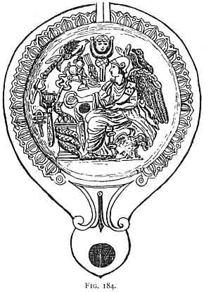 In all three moulds, and also on the lamp, are found the tongs or pincers of Pluto or rather Vulcan. Minervini says that he believes these to represent the shears of the Fates rather than the tongs of Pluto; but here again he is inconsistent with his own dictum. He says he cannot attempt to explain the obscure article near (i.e. below) the telajo (loom) of Ceres. Whatever this may be, there is the same nondescript at the foot of the ladder in all three plaques. Jahn calls this a shell, but in his mould (Fig. 181) it appears more like an acorn. I would suggest rather that in each case this object is meant for a pine-cone; the same symbol is found upon the lamp and on the hand, Figs. 156, 157. Minervini believes the object called a fig-leaf by Jahn, close to the lyre (Fig. 181), to be the same as that on Fig. 183, between the tongs and the moon. This he thinks to be a bunch of grapes for Dionysos--a bunch of grapes certainly