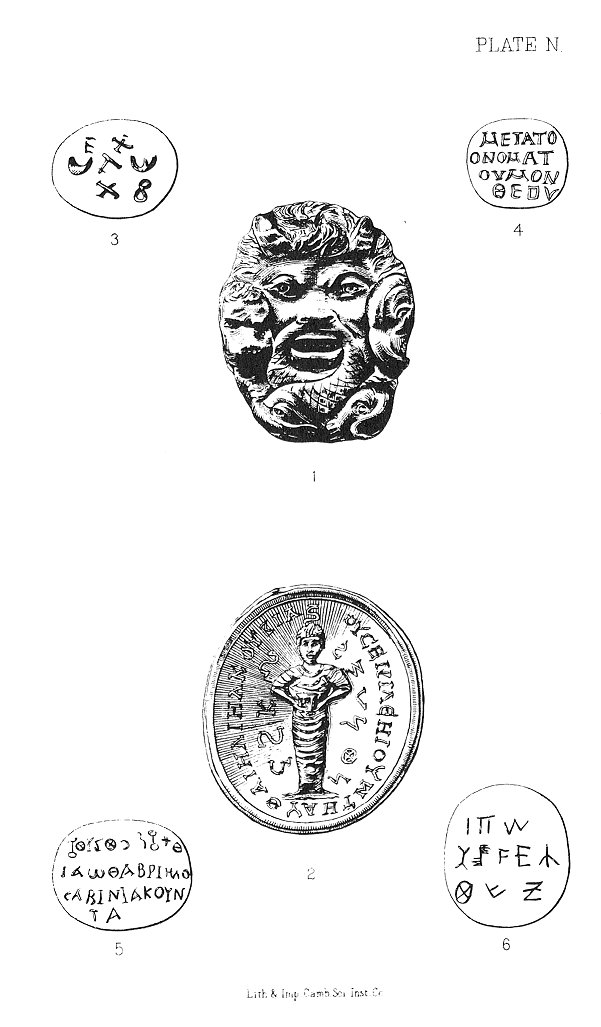 4. This spell, "Great is the Name of the One God," is the Jewish defiance to its rival, "Great is the Name of Serapis,"--of which Caylus publishes a beautiful example, in relief, of antique paste--a material that indicates a large manufacture of the same article to meet a constant demand.