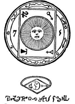 VIII. Gives invisibility, even to the eyes of genii, so that God alone shall witness the actions of the possessor. It is accompanied by the power of penetrating everywhere and passing through brick walls. The magical words are BENATIR, CARARKAU, DEDOS, ETINARMI. For each operation the ring must be placed upon a different finger of the right hand. The talisman is of yellow satin embroidered with black silk.