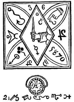 [paragraph continues] XATANITOS for a quinary, being careful to pronounce all the words at the quine--an instruction which I do not quite grasp, but if the art or science of the lottery is followed at this day under the old laws, I commend the question to those who are experts therein. This is one of the lesser mysteries of occultism. At cards the same potent formula should be repeated when shuffling for self or partner. Before beginning, touch your left arm with your right hand in the neighbourhood of the talisman, and kiss the ring. These little contrivances can be effected, says the honest Grimoire, without exciting the notice of your opponent.