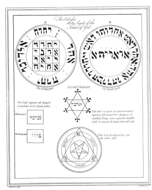 this verse, יהי אור זיהיאזר, that is, let there be light and there was light: in like manner the name Ararita, אראריתא from this verse, אהר ראש אהרזתז ראש ייהורו תמורהזואהר, that is, one principal of his unity, one beginning of his individuality, his vicissitude is one thing; and this name Hacaba, הקבא is extracted from this verse, יהקרואכברהוא the holy and blessed One; in like manner this name, Jesu, ישו is found in the heads of these two verses, viz., יביאשלוהולו, that is until the Messiah shall come; and the other verse,ינון שמוזית, that is, his name abides till the end. Thus also is the name Amen, אמנ, extracted from this verse, ארנימלר נאטן, that is, the Lord is the faithful King. Sometimes these names are extracted from the ends of words, as the same Amen from this verse, לאב והרשעים , that is, the wicked not so; but the letters are transposed: so, by the final letters of this verse, לימה אמזמח that is, to me what? or what is his name? is found the name Tetragrammaton: in all these a letter is put for a word, and a letter extracted from a word, either from the beginning, end, or where you please; and sometimes these names are extracted from all the letters, one by one, even as those seven-two names of God are extracted from those three verses of Exodus, beginning from these three words, יזסעו ידאו יט, the first and the last verses being written from the right to the left; but the middle contrariwise, from the left to the right, as we shall shew hereafter; and so sometimes a word is extracted from a word, or a name from a name, by the transposition of letters, as Messia, משיה, from Ismah, ישמה, and Michael from Malachi, מלאכי but sometimes by changing the alphabet, which the Cabalists call Ziruph, צירוף so from the name Tetragrammaton,יהוה, are drawn forth מצפצ, Maz-Paz, כוזו, Kuzu. Sometimes, by reason of the equality of the numbers, names are changed, as Merattron, מטטרון, pro Sadai שדי, for both of them make three hundred and fourteen; so Jiai, ייאי and El, אל, are equal in number, for both make thirty-one; and these are the hidden secrets, concerning which it is most difficult to judge, or to deliver a perfect science; neither can they be understood or taught in any other language but the Hebrew. Therefore, these sacred words have not their power in magical operations from themselves, as they are words, but from the occult divine powers working by them in the mind of those who by faith adhere to them.