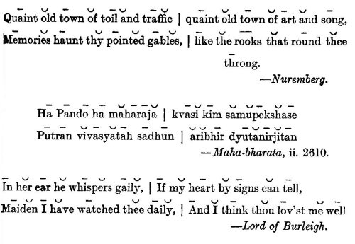 I have recited a verse in this English metre and a Sloka in presence of listeners who have a better ear for music than myself, and they have marked the close resemblance. I quote a few lines from the Sanscrit showing varieties of the Sloka metre, and comparing them with the scheme of the English metre selected.
