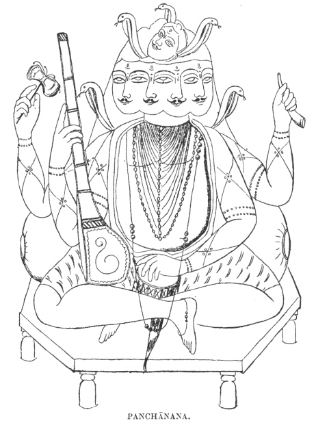 This is a form of Siva in which he is represented, as his name teaches, with five faces; the appearance of his body and the ascetic's dress being the same as in his ordinary forms. It is under this name that prayers for recovery from sickness are addressed to him as the physician or healer. In places where there is no temple, and no image of this deity, worship is offered to him before a shapeless stone, painted red, placed under a