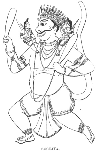 When Rāma finds this King of the Monkeys, he was an exile, having been driven from his throne by his brother Bāli. Kabandha, a giant slain by Rāma, gives the following description of the king to the wandering hero:—