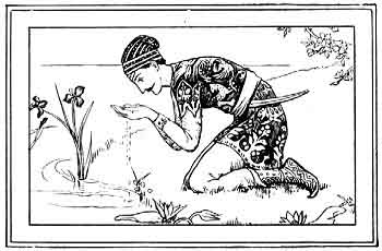 He saw a pretty, clear little brook running along not far from their resting-place, and hearing that its source was not far distant, he started off to find it. The source was a beautiful lake, which at that time was covered with the magnificent lotus flower and other water plants. The prince sat down on the bank, and being thirsty took up, some of the water in his hand. Fortunately he looked into his hand before drinking, and there, to his great astonishment, he saw reflected whole and clear the image of a beautiful fairy. He looked round, hoping to see the reality; but seeing no person, he drank the water, and put out his hand to take some more. Again he saw the reflection in the water which was in his palm. He looked around as before, and this time discovered a fairy sitting by the bank on the opposite side of the lake. On seeing her he fell so madly in love with her that he dropped down in a swoon.