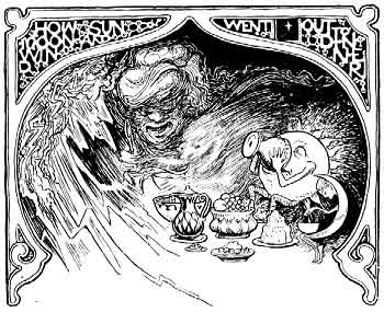 Now both Sun and Wind were greedy and selfish. They enjoyed the great feast that had been prepared for them, without a thought of saving any of it to take home to their mother--but the gentle Moon did not forget her. Of every dainty dish that was brought round, she placed a small portion under one of her beautiful long finger-nails, that Star might also have a share in the treat.