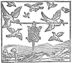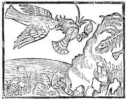Remarks.--An interesting point, to which I have drawn attention in my Introduction to North's Bidpai, is the probability that the illustrations of the tales as well as the tales themselves, were translated, so to speak, from one, country to another. We can trace them in Latin, Hebrew, and Arabic MSS., and a few are extant on Buddhist Stupas. Under these circumstances, it may be of interest to compare with Mr. Batten's conception of the Crane and the Crab that of the German artist who illustrated the first edition of the Latin Bidpai, probably following the traditional representations of the MS., which itself could probably trace back to India.