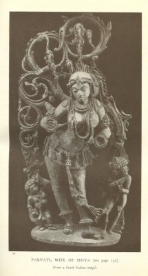 Sati was reborn as Uma, "Light", the impersonation of divine wisdom; as Amvika the same goddess was a sister of Rudra, or his female counterpart, Rudra taking the place of Purusha, the first man. Par´vati was another form of the many-sided goddess. Shiva taunted her for being black, and she went away for a time and engaged in austerities, with the result that she assumed a golden complexion.