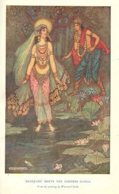 A day came thereafter when King Shantanu walked beside the Ganges. Suddenly there appeared before him a maiden of surpassing beauty. She was Ganga in human form. Her celestial garments had the splendour of lotus blooms; she was adorned with rare ornaments, and her teeth were radiant as pearls. The king was silenced by her charms, and gazed upon her steadfastly . . . In time he perceived that the maiden regarded him with love-lorn eyes, as if she sought to look upon him for ever, and he spoke to her, saying: "O slender-waisted and fair one, art thou one of the Danavas, or art thou of the race of Gandharvas, or art thou of the Apsaras; art thou one of the Yakshas or Nagas, 1 or art thou of human kind, O peerless and faultless one? Be thou my bride."