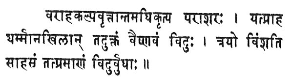 3. Vishńu Puráńa. "That in which Paráśara, beginning with the events of the Varáha Kalpa, expounds all duties, is called the Vaishńava; and the learned know its extent to be twenty-three thousand stanzas 41." The third Puráńa of the lists is that which has been selected for translation, the Vishńu. It is unnecessary therefore to offer any general summary of its contents, and it will be convenient to reserve any remarks upon its character and probable antiquity for a subsequent page. It may here be observed, however, that the actual number of verses contained in it falls far short of the enumeration of the Matsya, with which the Bhágavata concurs. Its actual contents are not seven thousand stanzas. All the copies, and in this instance they are not fewer than seven in number, procured both in the east and in the west of India, agree; and there is no appearance of any part being wanting. There is a beginning, a middle, and an end, in both text and comment; and the work as it stands is incontestably entire. How is the discrepancy to be explained?