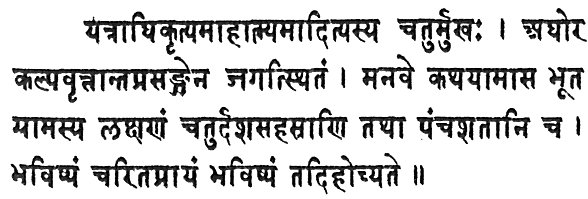 9. Bhavishya Puráńa. "The Puráńa in which Brahmá, having described the greatness of the sun, explained to Manu the existence of the world, and the characters of all created things, in the course of the Aghora Kalpa; that, is called the Bhavishya, the stories being for the most part the events of a future period. It contains fourteen thousand five hundred stanzas 62." This Puráńa, as the name implies, should be a book of prophecies, foretelling what will be (bhavishyati), as the Matsya Puráńa intimates. Whether such a work exists is doubtful. The copies, which appear to be entire, and of which there are three in the library of the East India Company, agreeing in their contents with two in my possession, contain about seven thousand stanzas. There is another work, entitled the Bhavishyottara, as if it was a continuation or supplement of the former, containing also about seven thousand verses; but the subjects of .both these works are but to a very imperfect degree analogous to those to which the Matsya alludes 63.