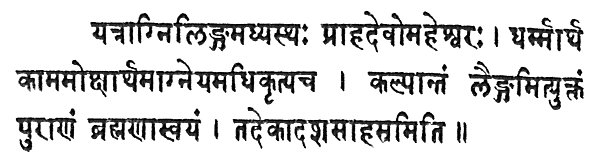 11. Linga Puráńa. "Where Maheśwara, present in the Agni Linga, explained (the objects of life) virtue, wealth, pleasure, and final liberation at the end of the Agni Kalpa, that Puráńa, consisting of eleven thousand stanzas, was called the Lainga by Brahmá himself 66."