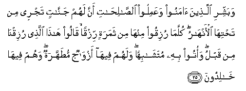 25. Wabashshiri allatheena amanoo waAAamiloo alssalihati anna lahum jannatin tajree min tahtiha al-anharu kullama ruziqoo minha min thamaratin rizqan qaloo hatha allathee ruziqna min qablu waotoo bihi mutashabihan walahum feeha azwajun mutahharatun wahum feeha khalidoona
