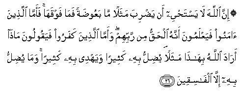 26. Inna Allaha la yastahyee an yadriba mathalan ma baAAoodatan fama fawqaha faamma allatheena amanoo fayaAAlamoona annahu alhaqqu min rabbihim waamma allatheena kafaroo fayaqooloona matha arada Allahu bihatha mathalan yudillu bihi katheeran wayahdee bihi katheeran wama yudillu bihi illa alfasiqeena