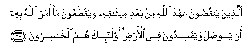 27. Allatheena yanqudoona AAahda Allahi min baAAdi meethaqihi wayaqtaAAoona ma amara Allahu bihi an yoosala wayufsidoona fee al-ardi ola-ika humu alkhasiroona