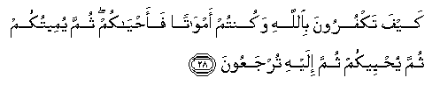 28. Kayfa takfuroona biAllahi wakuntum amwatan faahyakum thumma yumeetukum thumma yuhyeekum thumma ilayhi turjaAAoona