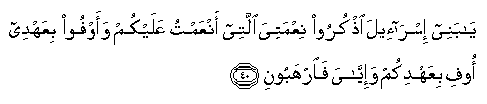 40. Ya banee isra-eela othkuroo niAAmatiya allatee anAAamtu AAalaykum waawfoo biAAahdee oofi biAAahdikum wa-iyyaya fairhabooni
