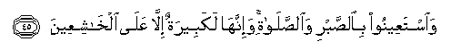 45. WaistaAAeenoo bialssabri waalssalati wa-innaha lakabeeratun illa AAala alkhashiAAeena