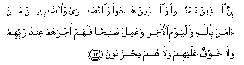 62. Inna allatheena amanoo waallatheena hadoo waalnnasara waalssabi-eena man amana biAllahi waalyawmi al-akhiri waAAamila salihan falahum ajruhum AAinda rabbihim wala khawfun AAalayhim wala hum yahzanoona