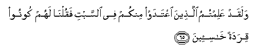 65. Walaqad AAalimtumu allatheena iAAtadaw minkum fee alssabti faqulna lahum koonoo qiradatan khasi-eena