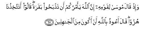 67. Wa-ith qala moosa liqawmihi inna Allaha ya/murukum an tathbahoo baqaratan qaloo atattakhithuna huzuwan qala aAAoothu biAllahi an akoona mina aljahileena