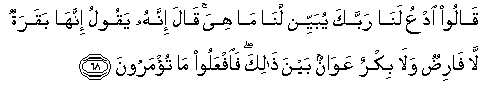 68. Qaloo odAAu lana rabbaka yubayyin lana ma hiya qala innahu yaqoolu innaha baqaratun la faridun wala bikrun AAawanun bayna thalika faifAAaloo ma tu/maroona