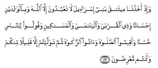 83. Wa-ith akhathna meethaqa banee isra-eela la taAAbudoona illa Allaha wabialwalidayni ihsanan wathee alqurba waalyatama waalmasakeeni waqooloo lilnnasi husnan waaqeemoo alssalata waatoo alzzakata thumma tawallaytum illa qaleelan minkum waantum muAAridoona