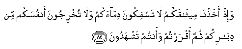 84. Wa-ith akhathna meethaqakum la tasfikoona dimaakum wala tukhrijoona anfusakum min diyarikum thumma aqrartum waantum tashhadoona