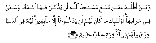 114. Waman athlamu mimman manaAAa masajida Allahi an yuthkara feeha ismuhu wasaAAa fee kharabiha ola-ika ma kana lahum an yadkhulooha illa kha-ifeena lahum fee alddunya khizyun walahum fee al-akhirati AAathabun AAatheemun