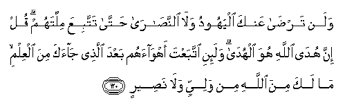 120. Walan tarda AAanka alyahoodu wala alnnasara hatta tattabiAAa millatahum qul inna huda Allahi huwa alhuda wala-ini ittabaAAta ahwaahum baAAda allathee jaaka mina alAAilmi ma laka mina Allahi min waliyyin wala naseerin