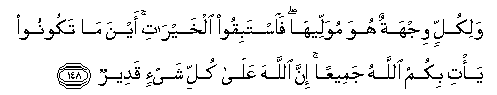 148. Walikullin wijhatun huwa muwalleeha faistabiqoo alkhayrati aynama takoonoo ya/ti bikumu Allahu jameeAAan inna Allaha AAala kulli shay-in qadeerun