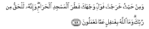 149. Wamin haythu kharajta fawalli wajhaka shatra almasjidi alharami wa-innahu lalhaqqu min rabbika wama Allahu bighafilin AAamma taAAmaloona
