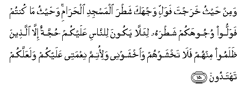 150. Wamin haythu kharajta fawalli wajhaka shatra almasjidi alharami wahaythu ma kuntum fawalloo wujoohakum shatrahu li-alla yakoona lilnnasi AAalaykum hujjatun illa allatheena thalamoo minhum fala takhshawhum waikhshawnee wali-otimma niAAmatee AAalaykum walaAAallakum tahtadoona