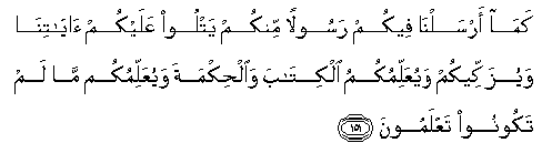 151. Kama arsalna feekum rasoolan minkum yatloo AAalaykum ayatina wayuzakkeekum wayuAAallimukumu alkitaba waalhikmata wayuAAallimukum ma lam takoonoo taAAlamoona