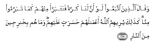 167. Waqala allatheena ittabaAAoo law anna lana karratan fanatabarraa minhum kama tabarraoo minna kathalika yureehimu Allahu aAAmalahum hasaratin AAalayhim wama hum bikharijeena mina alnnari