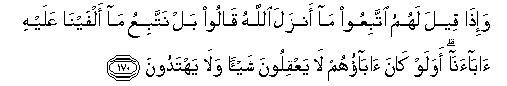 170. Wa-itha qeela lahumu ittabiAAoo ma anzala Allahu qaloo bal nattabiAAu ma alfayna AAalayhi abaana awa law kana abaohum la yaAAqiloona shay-an wala yahtadoona