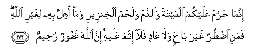 173. Innama harrama AAalaykumu almaytata waalddama walahma alkhinzeeri wama ohilla bihi lighayri Allahi famani idturra ghayra baghin wala AAadin fala ithma AAalayhi inna Allaha ghafoorun raheemun