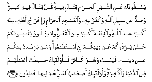 217. Yas-aloonaka AAani alshshahri alharami qitalin feehi qul qitalun feehi kabeerun wasaddun AAan sabeeli Allahi wakufrun bihi waalmasjidi alharami wa-ikhraju ahlihi minhu akbaru AAinda Allahi waalfitnatu akbaru mina alqatli wala yazaloona yuqatiloonakum hatta yaruddookum AAan deenikum ini istataAAoo waman yartadid minkum AAan deenihi fayamut wahuwa kafirun faola-ika habitat aAAmaluhum fee alddunya waal-akhirati waola-ika as-habu alnnari hum feeha khalidoona