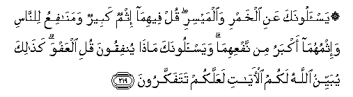 219. Yas-aloonaka AAani alkhamri waalmaysiri qul feehima ithmun kabeerun wamanafiAAu lilnnasi wa-ithmuhuma akbaru min nafAAihima wayas-aloonaka matha yunfiqoona quli alAAafwa kathalika yubayyinu Allahu lakumu al-ayati laAAallakum tatafakkaroona