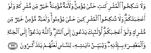 221. Wala tankihoo almushrikati hatta yu/minna walaamatun mu/minatun khayrun min mushrikatin walaw aAAjabatkum wala tunkihoo almushrikeena hatta yu/minoo walaAAabdun mu/minun khayrun min mushrikin walaw aAAjabakum ola-ika yadAAoona ila alnnari waAllahu yadAAoo ila aljannati waalmaghfirati bi-ithnihi wayubayyinu ayatihi lilnnasi laAAallahum yatathakkaroona