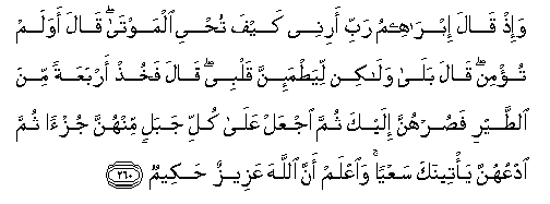 260. Wa-ith qala ibraheemu rabbi arinee kayfa tuhyee almawta qala awa lam tu/min qala bala walakin liyatma-inna qalbee qala fakhuth arbaAAatan mina alttayri fasurhunna ilayka thumma ijAAal AAala kulli jabalin minhunna juz-an thumma odAAuhunna ya/teenaka saAAyan waiAAlam anna Allaha AAazeezun hakeemun