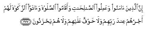 277. Inna allatheena amanoo waAAamiloo alssalihati waaqamoo alssalata waatawoo alzzakata lahum ajruhum AAinda rabbihim wala khawfun AAalayhim wala hum yahzanoona
