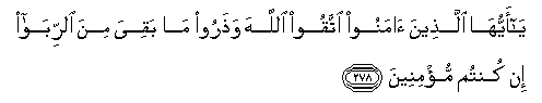 278. Ya ayyuha allatheena amanoo ittaqoo Allaha watharoo ma baqiya mina alrriba in kuntum mu/mineena