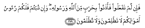 279. Fa-in lam tafAAaloo fa/thanoo biharbin mina Allahi warasoolihi wa-in tubtum falakum ruoosu amwalikum la tathlimoona wala tuthlamoona
