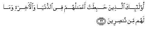 22. Ola-ika allatheena habitat aAAmaluhum fee alddunya waal-akhirati wama lahum min nasireena