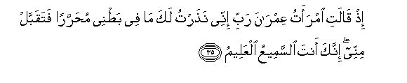 35. Ith qalati imraatu AAimrana rabbi innee nathartu laka ma fee batnee muharraran fataqabbal minnee innaka anta alssameeAAu alAAaleemu