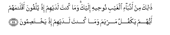 44. Thalika min anba-i alghaybi nooheehi ilayka wama kunta ladayhim ith yulqoona aqlamahum ayyuhum yakfulu maryama wama kunta ladayhim ith yakhtasimoona