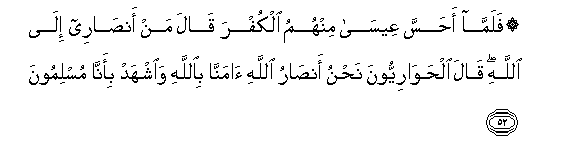 52. Falamma ahassa AAeesa minhumu alkufra qala man ansaree ila Allahi qala alhawariyyoona nahnu ansaru Allahi amanna biAllahi waishhad bi-anna muslimoona
