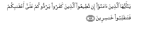 149. Ya ayyuha allatheena amanoo in tuteeAAoo allatheena kafaroo yaruddookum AAala aAAqabikum fatanqaliboo khasireena